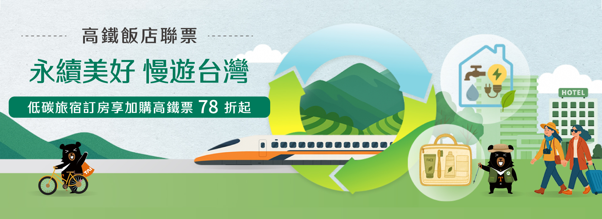 響應永續旅行,入住捷絲旅宜蘭礁溪館3天2夜加購高鐵聯票,住宿期間不提供打掃及一次性備品,回饋旅人為地球盡一份心力,每房加贈「品牌購物袋」好禮一份!