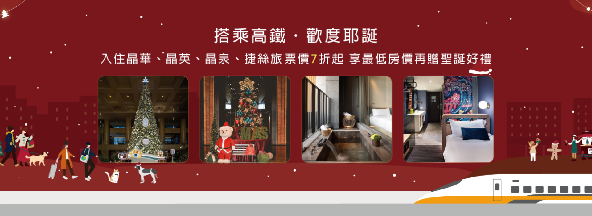 【搭高鐵.住晶華歡度耶誕】即日起至晶華國際酒店集團旗下13間酒店官網訂房,加購車票享平日(週一至四) 7折、假日(週五至日) 8折優惠,詳情請見活動網頁